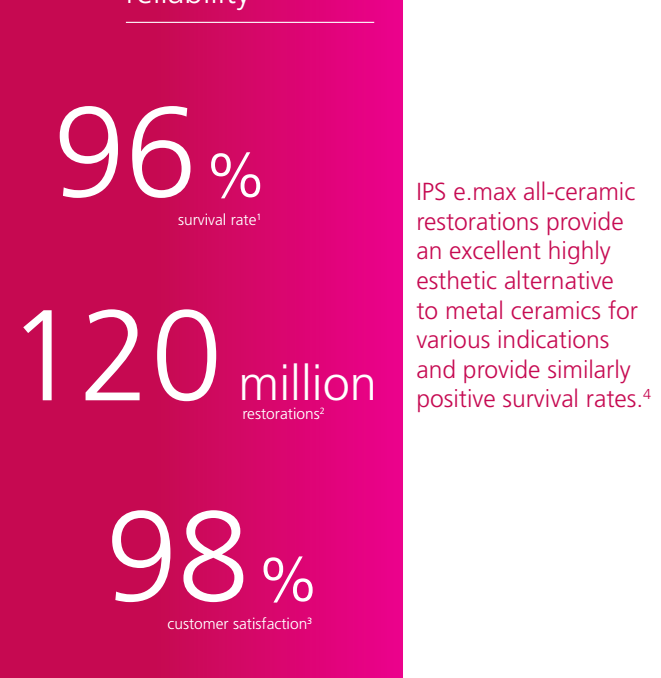 Beauty means nothing without reliability – and IPS e.max delivers both. With over 230 million restorations placed globally and clinical survival rates exceeding 95%, this material has proven its long-term durability in both single and multi-unit restorations. That’s why it’s trusted by dentists and loved by patients around the world.