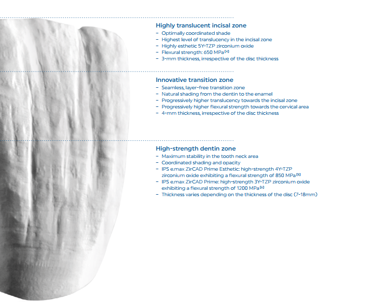 Rather than using a single material for the entire restoration, the optimal solution is to combine different types of zirconia according to specific functional zones: